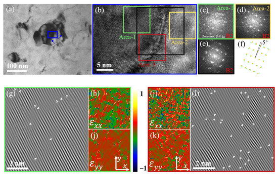 TEM observation of the trained sample: (a) bright-field image; (b) HRTEM image; (c–e) show the fast Fourier transformation (FFT) patterns; (f) is an indexed FFT pattern sketch of (e); (g,l) show the IFFT of (c,e); (h,i) and (j,k) are, respectively, the GPA results of area-1 and area-3 in (b).