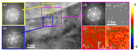 TEM observation of a grain boundary for the trained sample: (a,b,d) show the FFT patterns of the area indicated by yellow, blue and pink squares, respectively; (c) the HRTEM image; (e–g) show the IFFT patterns and GPA results of the area indicated by pink square.