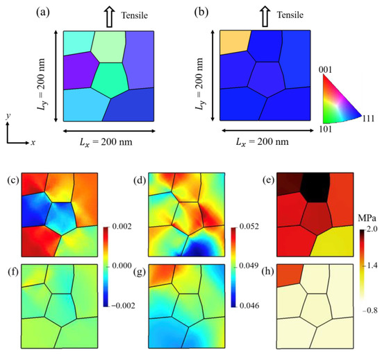Grain orientations used in the simulations for (a) the as-received and (b) the trained samples, respectively. (c–e) are the contour plots of and the strain energy density of the as-received sample, respectively. (f–h) are the contour plots of and the strain energy density of the trained sample, respectively. The applied strain was 5%.