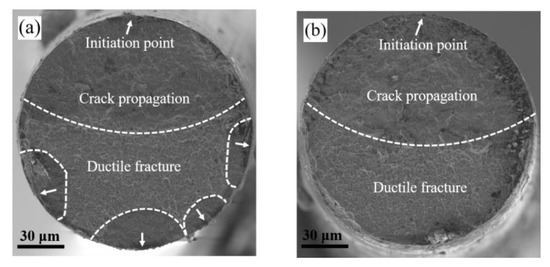 The fracture surfaces of the as-received and trained samples after fatigue tests until failure are shown in Figure 13. The fracture surfaces for both samples were divided into crack nucleation points, fatigue crack propagation areas, and ductile fracture areas. Surface scratches and impurities introduced during material processing generally act as the crack nucleation sites [56]. In this study, the surface state of both groups of NiTi wires was similar. The growth of cracks for the as-received sample was multi-regional, whereas that of the trained sample was single-regional. The difference was attributed to the effective driving force for crack growth. For the as-received sample, the applied stress was higher during the fatigue test (Figure 4b), and the local stress concentration caused by the anisotropy of the grains with different orientations was more severe; both contributed to the formation of persistent slip bands and micro-cracks. The persistent slip bands reduced the local stress intensity factor, and the micro-cracks evolved into macroscopic cracks [57,58]. Thus, the fatigue crack propagation is easier in the as-received sample. In the trained sample, the relatively uniform stress distribution and increased energy dissipation reduced the driving force and increased the resistance to crack propagation, so the cracks tended to propagate in the preferred direction.