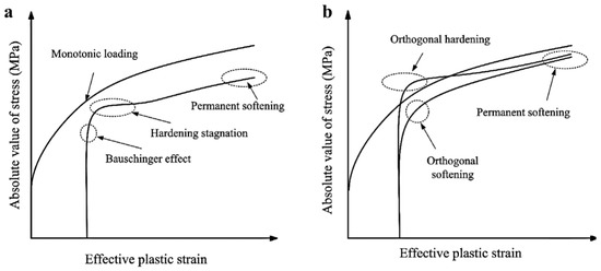 - The trade-off between model completeness and simplicity according to the practical requirements: As mentioned in Section 3.2.1, the sufficient description of each decomposed nonlinear hardening behavior requires an independent state variable comprising at least two parameters. Thus, a detailed description of each anisotropic hardening behavior may result in the excessive parameters in a hardening model. For one thing, to ensure their completeness, the hardening models must meet the following requirements: (i) The descriptions of different hardening behaviors should be decoupled with each other, compatible to be insert into different models, and flexible to reproduce different details of the hardening behaviors (e.g., whether the phenomenon that the origin of the stress space lie outside the yield surface can be reproduced); (ii) global optimization should be avoided in parameter determination because the effects of different parameters may diminish over time; and (iii) more microstructure evolution mechanism from physics-based models should be incorporated (e.g., the description of orthogonal hardening in HAH 14 (Equation (42)) is inspired by the dislocation-based hardening function in Rauch 11). For another, a hardening model’s competence and accuracy can be sacrificed to some extent for easy use. Simplification can be conducted by describing multiple hardening behaviors with a single variable (e.g., the description of the Bauschinger effect and yield surface distortion in the François 01 and Feigenbaum 07 model); however, such simplification may introduce some unexpected problems. Thus, hardening modeling should be conducted in close accordance with the specified materials and forming processes.