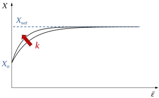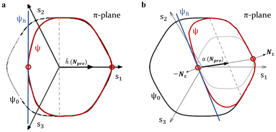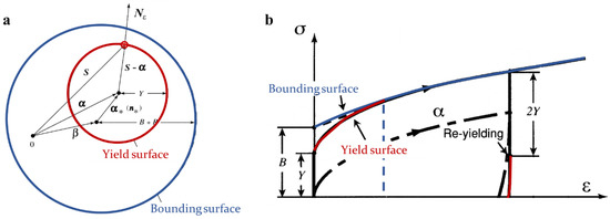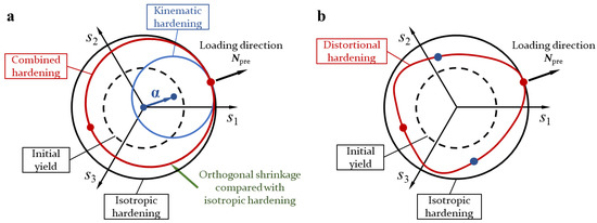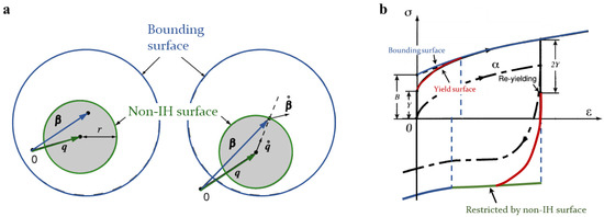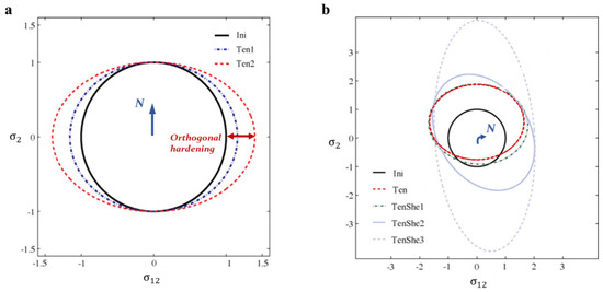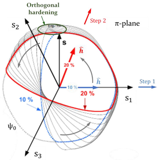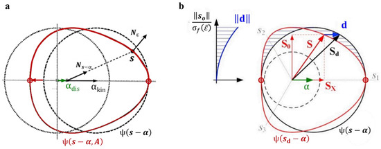 - In the first step, state variables are introduced into the original hardening function (Equation (4)) to describe the shape of the distorted yield surface. In this paper, represents the set of internal state variables.