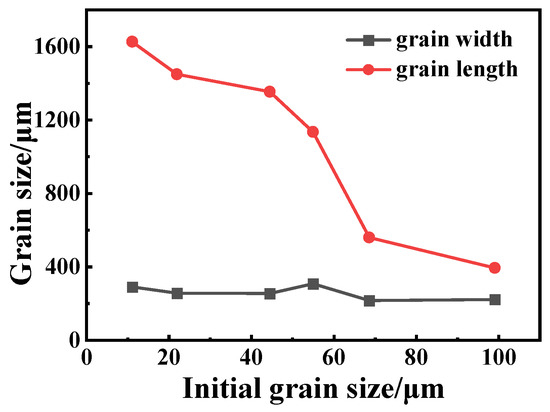 - The grain length decreases as the initial grain size increases after directional annealing. A large initial grain size is not conducive to the formation of columnar grains. There is an upper limit of initial grain size for columnar grain formation. As the GB velocities of grains with a large initial grain size are low, the grain boundaries at the heat zone are difficult to move with the heat zone. The larger initial grain size causes in the lower GB velocities, which results in the GB cannot keep up with the moving heat zone;