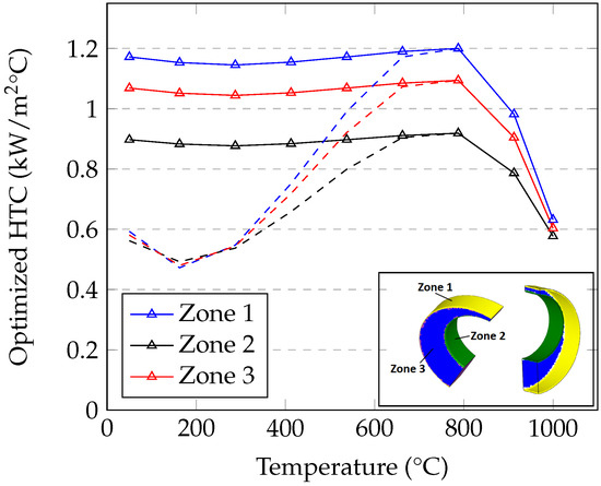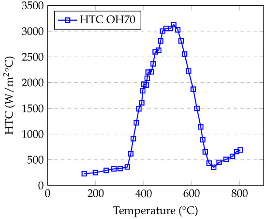Specimen Nos. 1 to 6 were processed by LPC at 921 °C, which consisted of 16 boost–diffusion cycles. The carbon carrier boosts’ total time was 17 min, while the entire process time was approximately 9.5 h. After the LPC was finished, specimens were cooled down slowly to room temperature. The load, containing three carburized specimens, Nos. 1, 2, and 3, and three that were kept uncarburized, Nos. 7, 8, and 9, was then heated up to 913 °C and held at this temperature for a sufficient period of time to ensure obtaining a homogeneous temperature and, therefore, the austenitic microstructure in the whole volume, then quenched. A standard industrial procedure for parts requiring dimensional stability cryogenic treatment at −75 °C was performed to finish the martensitic transformation. Tempering was performed at 230 °C for 4 h. As two different techniques of quenching were employed in this research, a variety of heat-transfer-related parameters had to be incorporated into the simulation. A protective copper cladding was employed for specimens hardened in oil to prevent surface oxidation and decarburization. The copper coating and stripping were performed electrochemically. Oil quenching was performed in the RIVA automatic quenching system, which includes a rotary furnace RDLS with a heating power of 10 kW, a quenching bath OQ-1000 equipped with a 1.1 kW agitation pump, and vertical collectors to ensure vertical stirring of the OH70 oil. The oil temperature was 45 °C. The heat transfer coefficient of the oil is shown in Figure 2. The heat transfer in the gas quenching was considered convective and almost constant [20], which is not realistic and constitutes the need for optimization to find realistic values. For the sake of this research, the value of the heat transfer coefficient (HTC) to the environment during gas quenching was optimized utilizing parabola optimization methods. The cooling curves captured during an experiment were the objectives. As shown in Figure 3, three heat transfer zones were defined, and specific upper and lower bounds and initial guesses were initialized for each. The HTCHPGQ optimization results were further used in the simulations.