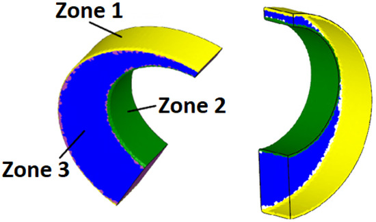 The inverse thermal analysis and optimization result were that heat removal from the top, side, and bottom surfaces proceeds at different rates. Such behavior is related to the transient characteristic of cooling and the turbulent flow of the gas, which heats up at different rates during the cooling of the sample, changing its ability to accumulate energy. As a result, different heat transfer coefficient values are locally active on the surface. The DEFORM3D Inverse Heat Transfer module was utilized for this part of the simulation due to its capability to determine heat transfer coefficients based on an objective function, which in the case of quenching are the cooling curves at specific points and an environmental temperature drop as a boundary condition [42]. Optimization revealed that the heat transfer coefficient values vary depending on the temperature and the specimen’s location. The highest values were found for the outer diameter surface (Zone 1) reaching its maximum, i.e., 1.2 for a temperature of approximately 800 °C. Intermediate values of around 1.1 were determined for the specimen’s flat faces (Zone 3). In contrast, the lowest heat transfer of a maximum of 0.87 was found for the inner diameter (Zone 2).