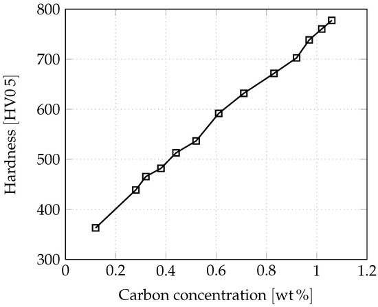 Multiple models are available in the literature describing models for hardness calculations, among which the Maynier model Equation (20) is considered reliable, although limited to carbon concentration up to 0.5%wt [40]. An additional Equation (21) for martensite hardness containing over 0.5% of carbon was proposed by Leslie [41]:
