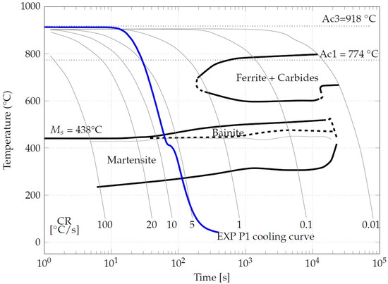 The computed cooling rates presented similarity to those obtained from the experiment. The choice of a cooling rate of 11 °C/s was found for a temperature T = 715 °C, which corresponds to a time point of t = 26 s of the quenching process. The decrease of the cooling rate value corresponding to a temperature of 422 °C was related to the temperature dropduring the exothermic martensitic transformation, as may be observed in Figure 14.