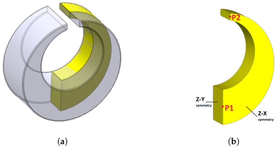 Computational domain (a) and FE model with control points P1 and P2 and symmetry planes (b).