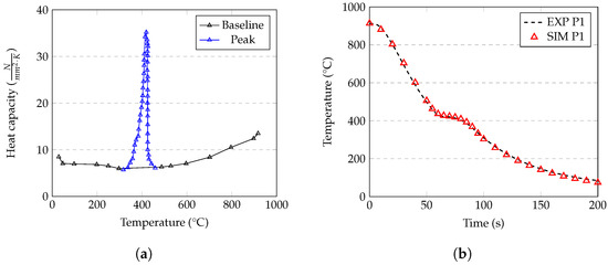The results showed the heat transfer coefficients as a function of temperature at the computational boundary, so influenced by the thermal field only with no accounting of time. The dashed lines in Figure 10 represent the results of the simulation, which did not take the latent heat of martensitic transformation into account; therefore, a dimple in the curves, reaching the minimum at 0.5 , is visible. This is a numerical artifact caused by the apparent heat capacity of the material. Further analyses of the heat transfer allowed us to optimize the apparent heat capacity and compute the value of the latent heat of the martensitic transformation by integrating the function described by the heat capacity peak’s data points. Integration with the trapezoid method and 100 steps were utilized, and eventually, the latent heat of 244 was determined and used in further simulations. Figure 11 shows the optimization results for the heat capacity and the cooling, where the determined value of martensitic transformation latent heat was used.
