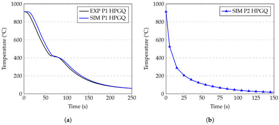Cooling was analyzed at two control points of the specimen marked in Figure 8. Point P1 was located in the middle of the thickest cross-section and was the indicator of the core material behavior. At the same time, the position of point P2 was aimed at carburized case analysis and, therefore, was located in the thinnest zone 0.05 mm circumferentially under the surface. Quenching started at time point t = 0. As presented in Figure 13a, in the first 10 s, the temperature did not drop, which is related to the location of the control point P1 in the center of the thickest cross-section, 7.95 mm from the surface. Because of the material’s heat conductivity, a temperature dropin the experimental curve may be observed. Martensitic transformation starts at approximately 421 °C, and because it is exothermic, the latent heat released during transformation contracts the quenching extraction, causing a plateau in the cooling curve. The amount of latent heat for Pyrowear 53 was calculated as presented in Section 3.1, and it was found to be equal to 244 . Figure 13b presents a simulated cooling curve for control point P2 located 0.05 mm from the surface. Here, the temperature decreases much faster with no initial period of constant temperature. Because of the carbon concentration in the surface layer is equal to approximately 1.1% wt. and the martensitic transformation starts slightly above 100 °C (see Figure 7), the plateau in the cooling curve may not be observed.