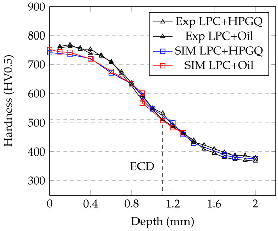 Results of hardness profile simulation comparison with the experimentally measured after the HPGQ and oil quenching processes.