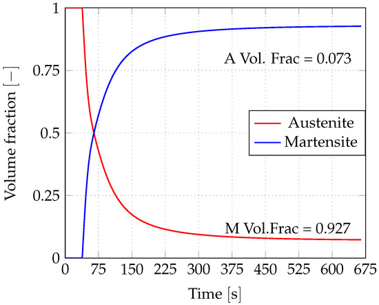 where is the temperature at a specific time step and and represent the volume phase fractions of martensite and austenite, respectively.