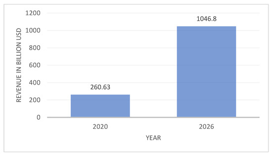 Size of the global market for EVs in 2020 and 2026 (in billions USD) Data source: [28].