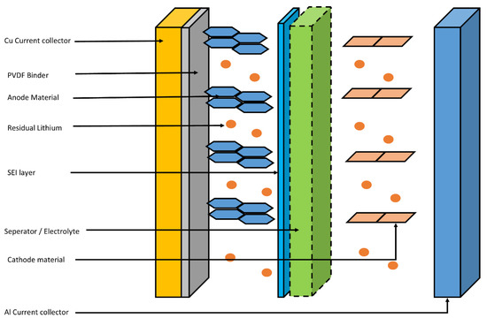 For instance, graphite is attached to the Cu current collector through polyvinylidene fluoride (PVDF) layer in LIB. Additionally, between the surface of the graphite and the electrolyte, the solid electrolyte interface (SEI) is being built through a reaction between the graphite surface and the Li from electrolyte during the recharge and discharge cycles. Usually, electrolyte is made up of Li salts such as LiPF6 or LiClO4 dissolved in organic solvents. As an organic solvent, ethylene or ethylene carbonate is used [72,73]. Authors suggest that, at the EoL of the LIB, the spent anode material can contain residuals from all these electrolytes and binders, as well as Cu foil with a higher degree of degradation to the anode material [74,75,76].