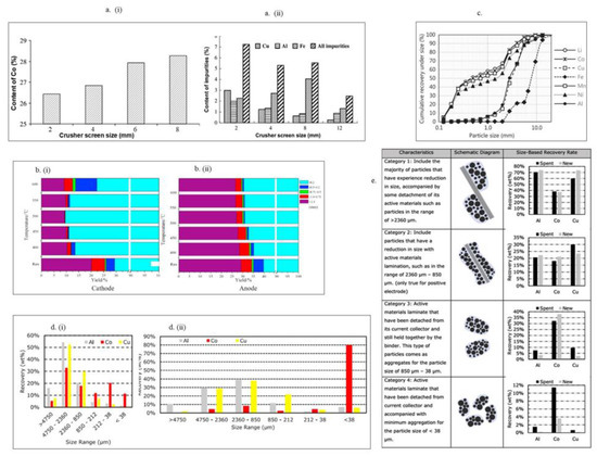 Summary of dismantling methods (a). The effect of the sieve size on (a(i)) Co and (a(ii)) the impurity content in the underflow products [139], (b). The particle size distribution of the crushed products at different pyrolysis temperatures: (b(i)) cathode and (b(ii)) anode [141], (c). Cumulative recovery of undersized particle of different elements [143], (d). Percentage recovery of different elements based on particle sizes: (d(i)) after crushing and (d(ii)) after an additional attrition scrubbing [146], (e). Characterization of liberated particles based on their sizes and age of the LIBs [135].
