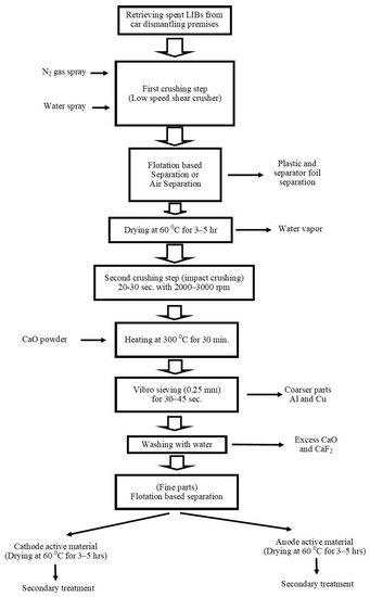 - Kim, S.; Bang, J.; Yoo, J.; Shin, Y.; Bae, J.; Jeong, J.; Kim, K.; Dong, P.; Kwon, K. A Comprehensive Review on the Pretreatment Process in Lithium-Ion Battery Recycling. J. Clean. Prod. 2021, 294, 126329. [Google Scholar] [CrossRef]