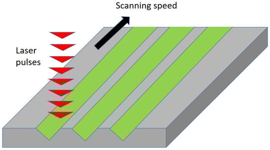 Superelastic Nitinol 250 μm thick plates in straight annealed and electropolished condition were used to be treated by the femtosecond laser for performing texturing experiments. A femtosecond laser (mod. Pharos 15 W from Light Conversion, whose main characteristics are listed in Table 1), coupled with a galvanometer (mod. Cambridge Technology PS1), was used for inducing surface modification on areas of 4 × 10 mm2. The experiments were carried out in air by changing laser power and scanning velocity according with a full factorial design of experiments (see the parameters listed in Table 2). The schematic of the laser texturing process is depicted in Figure 1.