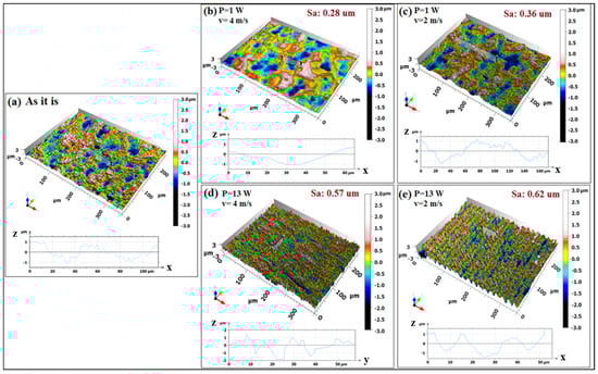Three-Dimension-profilometry and 2D profile of as it is sample (a); P = 1 W, v = 4 m/s (b); P = 1 W, v = 2 m/s (c); P = 13 W, v = 4 m/s (d) and P =13 W, v =2 m/s (e).