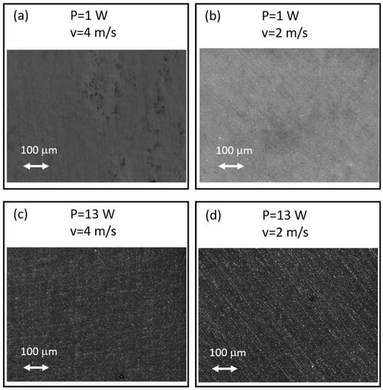 SEM images of the laser textured surfaces, processed at P = 1 W, v = 4 m/s (a); P = 1 W, v = 2 m/s (b); P = 13 W, v = 4 m/s (c); and P = 13 W, v = 2 m/s (d). SEM images were acquired at low magnification (500×).