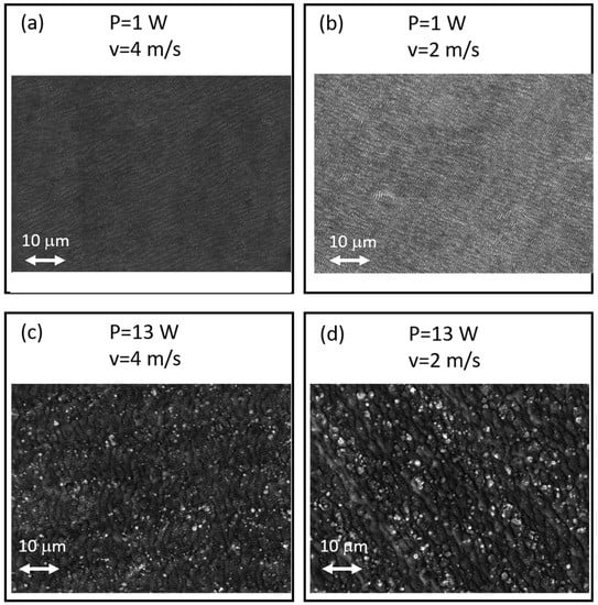 SEM images of the laser textured surfaces, processed at P = 1 W, v = 4 m/s (a); P = 1 W, v = 2 m/s (b); P = 13 W, v = 4 m/s (c); and P = 13 W, v = 2 m/s (d). SEM images were acquired at high magnification (3000×).