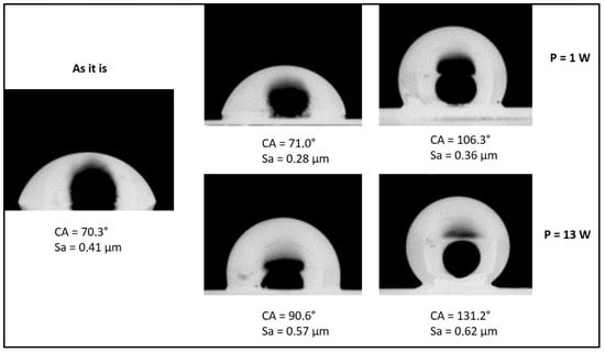 Another relevant surface characteristic is represented by the wettability. The homogeneity of peaks and valleys distribution was also confirmed by the symmetry of the droplet for such a sample. Contact angle (CA) images are reported in Figure 6 for all the surfaces. It can be seen that the wetting properties of the different laser textured surfaces are modified, according with the investigated process conditions, when compared with the initial untreated surface.