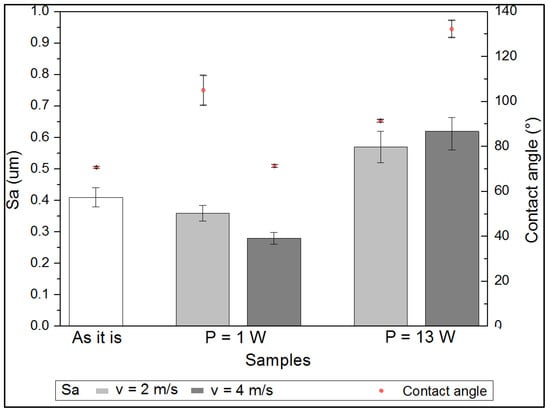 In the same graph (see Figure 7) the contact angle values of a high purity water droplet on samples surface are reported. The CA values grow with the increasing of the roughness both for P = 1 W and P = 13 W samples. Observing the 2D-profiles of samples reported below each 3D-topography (see Figure 2), it is possible to affirm that surfaces treated at P = 13 W, v = 2 m/s showed the most regular and homogenous pattern.