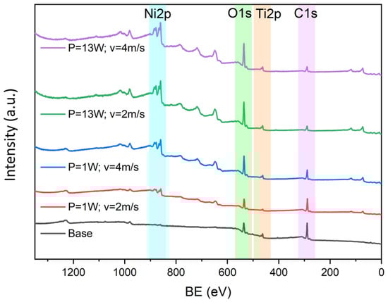XPS analyses were performed on the pristine sample (as it is) and the four laser textured samples to investigate the composition and chemical–physical features of the surface. All samples, including the laser textured surfaces and the initial surface, show similar spectra, as depicted in Figure 8. Particular focus was added to the Ni2p, O1s, Ti2p and C1s regions of the XPS spectrum.