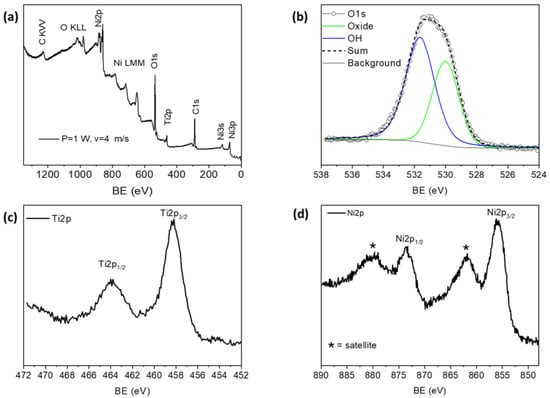Figure 9a shows survey scans for the untreated and the four processed samples. Due to the similarities of the acquired spectra, only the sample processed with the process parameters (P = 1 W, v = 4 m/s) are here discussed in detail. Detailed spectra for the other samples are reported in the Supplementary Material section (Figures S1–S4). Figure 9b–d displays the high-resolution scans for the O1s, Ti2p and Ni2p regions. Table 3 reports the binding energies for the O1s, Ti2p and Ni2p photoemission peaks; all the samples have very similar values. The binding energies of the Ti2p and Ni2p peaks suggest that these two elements are present in an oxidized form on the surface. Indeed, the BE of Ti2p is compatible with the presence of Ti4+ in an oxide environment [31] and that of Ni2p with the presence of Ni2+ in Ni(OH)2 with the characteristic satellite peaks [32,33]. In agreement with this, the photoemission peak of O1s presents two contributions attributable to an oxide (ca. 530 eV) and a hydroxide (ca. 531.5 eV) component, respectively. Table 4 reports the element atomic percentage for the analyzed samples. The variable amount of carbon essentially derives from adventitious carbon. It is worth noting that in the pristine sample the amount of Ni on the surface is significantly lower and its contribution increases at the increasing of the treatment power (see Ni/Ti ratio in Table 4). The ratio between the two oxygen components remains almost constant.