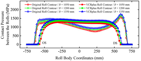 It can be seen from Figure 11 and Figure 12 that after the back-up roll adopts the VCRplus roll contour, the contact pressure between the rolls becomes uniform as a whole, and the peak of the contact pressure between the rolls on both sides of the roll disappears. Due to the VCRplus back-up roll contour added the characteristic of the CVC roll contour, largely counteracts the ‘anti-CVC shape’ contact pressure distribution between the rolls, conducive to uniform wear. It can be seen from Table 6 and Table 7 that the coefficient, K, under the VCRplus roll contour exhibited a significant decrease at each working condition, approximately 21%~25%; the maximum value of the contact pressure between the rolls decreased by approximately 15%~18%. The VCRplus roll contour had a better variable contact performance; therefore, the length of the contact area between the rolls under different widths and different rolling forces changed significantly compared with the original roll contour, which adapted to the change in strip width.