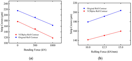 The strip profile control ability of the VCRplus back-up roll contour and the original back-up roll contour is further compared and analyzed by calculating the strip crown with different unilateral bending forces and unit width rolling forces, as shown in Figure 14. Compared with the original roll contour, the bending force control effect of VCRplus roll contour is increased by 11.8%, and the transverse stiffness of the roll gap is increased by 32.2%. The strip profile control ability and the stability are clearly improved.