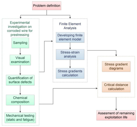 The methodology for the life assessment of corroded wire for prestressing is developed and shown with an algorithm, Figure 1. This new methodology is a partial modification of similar methodologies developed for fatigue life assessment of a few standard machine elements, developed and presented by Atanasovska et al. [21], Momcilovic et al. [22], and Atanasovska et al. [23], and is based on the main postulates of the Theory of Critical Distances (TCD).