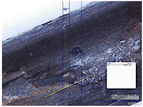 Quantification of surface defects was performed on a 3D digital microscope, HIROX RH-2000 (HIROX, Tokyo, Japan), Figure 6. The real geometry and profile of the corrosion damage were analyzed in order to check the presumption that there was a possibility for reducing the geometry on these high-tensile steel wires.
