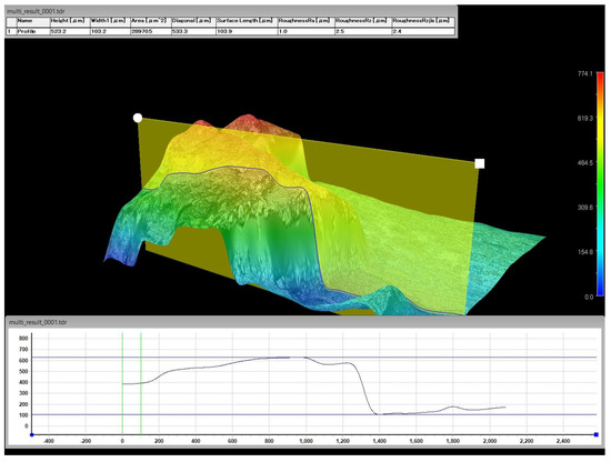 Three-dimensional profile of corrosion damage after checking with a microscope, HIROX RH2200. The result is derived from the profile marked with the yellow line shown in Figure 4.
