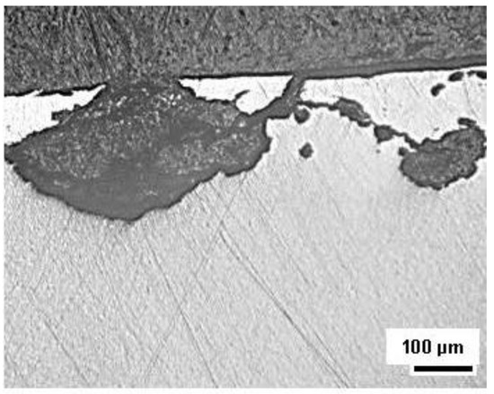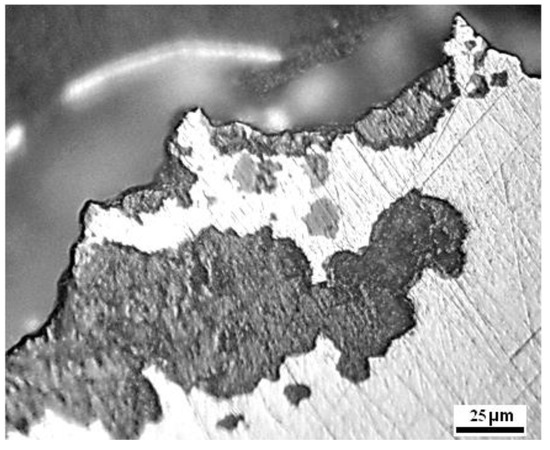 The results of the tensile test indicate a strong influence of the local level of corrosion damage, particularly the inclusion of “hidden” subsurface damage, as shown on Figure 7 and Figure 9. The experimentally obtained results of dimensional analysis (Table 1) and tensile testing (Table 3) show that the diameter of the corroded wire is significantly reduced by approximately 10%, and the cross-section is even more reduced, by approximately 18%. The tensile strength is reduced by only 5.5%, based on the comparison of the experimental results for tensile strength given in Table 3 with the referent value from the literature [25].