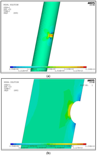 Finite Element Analysis (FEA) of the wire with corrosion pits was performed in order to calculate the stress state of the investigated cases of corrosion damages on the wire for the prestressing of reinforced concrete [12,20,21,22,26]. This Finite Element Analysis was performed using ANSYS Mechanical APDL commercial software (ANSYS 19R3 version, ANSYS, Inc., Canonsburg, PA, USA), which successfully solves different kinds of problems related to specific geometry as the source of stress concentration, such as the problem of geometric evaluation and constructal design [7], as well as the optimization of the geometrical and material characteristics of specific products [27] or coupled problems including nonlinear contact phenomenon [23].
