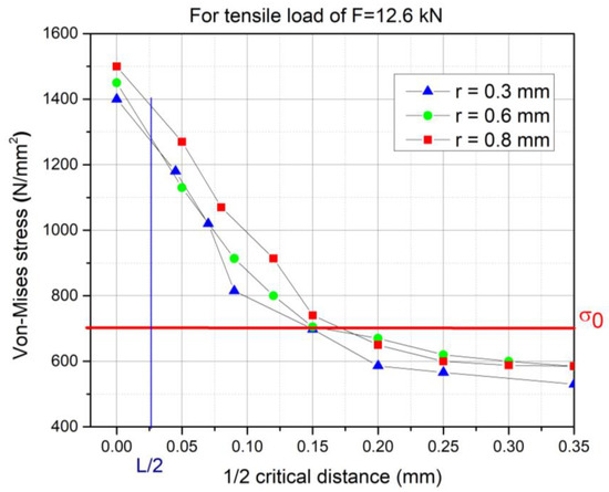 Half of the obtained critical distance is shown with a blue line and marked as L/2 in the diagram of FEA-calculated stress gradients; Figure 13.