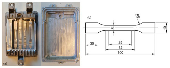 (a) Power electronics casing showing the position of the tensile specimens; (b) Specimen’s dimensions (in mm).