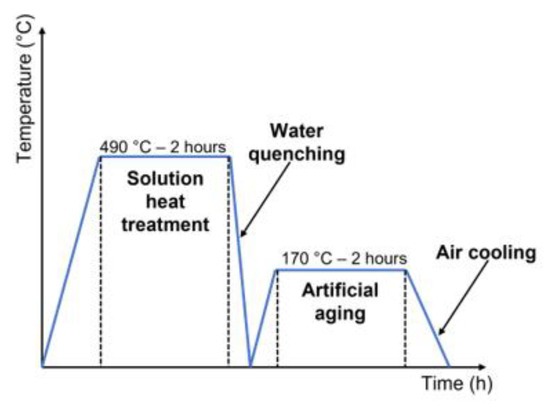 The T6 heat treatment (Figure 2) was performed in an M. J. Amaral forced convection furnace (M.J.Amaral—Equipamentos Industriais Lda, Vale de Cambra, Portugal) with a chamber of dimensions 600 × 600 × 700 mm³. The furnace chamber has three thermocouples along its height to evaluate the temperature distribution, and three test parts instrumented with thermocouples were used to monitor the temperature throughout the heat treatment.