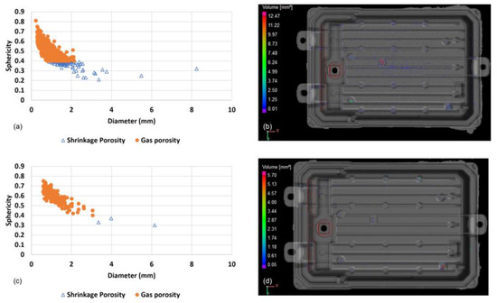 Analysis of defects in the as-cast state. (a) Sphericity and diameter of the porosities present in the AlSi10MnMg alloy No. 1 part (HPDC); (b) Results of CT analysis of AlSi10MnMg alloy No. 1 part (HPDC); (c) Sphericity and diameter of the porosities present in the AlSi10MnMg alloy No.3 part (VADC); (d) Results of CT analysis of AlSi10MnMg alloy No. 3 part (VADC).