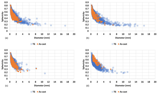 By analyzing the graphs in Figure 3, it can be seen that the reduction in the quantity of defects is mainly due to a reduction in the number of gas porosities. The difference between shrinkage and gas porosity was based on the work of Kang et al. [20]. The distinction was made taking into account the sphericity of the defect, i.e., defects with sphericity ≥0.4 were considered gas porosities. From the analysis of the graphs, it is also possible to conclude that there is a large number of shrinkage porosities with sphericity very close to 0.4, which can be a combination of shrinkage porosity and gas porosity. In addition, it is possible to conclude that the smaller the defect diameter, the higher its sphericity.