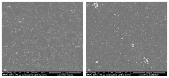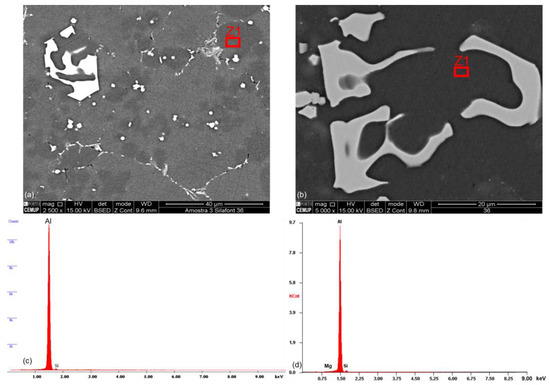 Due to the high cooling rates typical of the HPDC process, there is a refinement of the microstructure that makes it difficult to identify typical phases of these alloys by optical microscopy. To facilitate this analysis, SEM-EDS was used. In Figure 6, the backscattered SEM images of AlSi10Mg(Fe) and AlSi10MnMg alloys are presented. In this mode, the higher the atomic number of the element, the brighter it will be in the image. Comparing both images of Figure 6, knowing that iron has a higher atomic number than silicon, magnesium, aluminum, and manganese and that the β-Al5FeSi phase has a morphology that resembles a needle, it is possible to conclude that AlSi10Mg(Fe) secondary alloy (Figure 6a) has a higher amount of needles (detrimental to ductility) than the primary AlSi10MnMg alloy (Figure 6b).