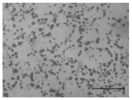 After the T6 heat treatment due to solution heat treatment, silicon fragmentation and spheroidization occurred in both alloys (AlSi10Mg(Fe) and AlSi10MnMg). Figure 8 shows the microstructure of AlSi10MnMg alloy after heat treatment.