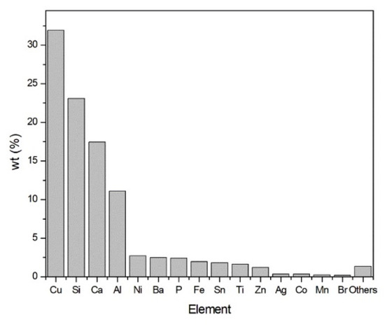 Figure 2 shows the chemical composition of the comminuted PCBs, which was obtained by analysis using energy-dispersive X-ray fluorescence spectrometry (XRF), from which it can be seen that Cu was the metal present in the greatest mass percentage (31.95 wt%). In addition, the Ag (0.34 wt%) detected by XRF indicates the possibility of recovering precious metals from this waste in future studies.