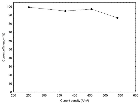 Copper deposits were obtained from synthetic solutions (15 g/L CuSO4) to determine the optimum current density as a function of the current efficiency in four different current densities based on the information present in the literature for the traditional copper electrowinning process [34]. The current efficiency in different current densities is displayed in Figure 3. It can be observed that at 250, 370 and 450 A/m2, the current efficiencies were above 94%. However, at 540 A/m2, the current efficiency presented the lowest value (approximately 87%). The highest current efficiency (99.3%) was obtained at 250 A/m2. Therefore, the current density of 250 A/m2 was adopted in the further experiments.