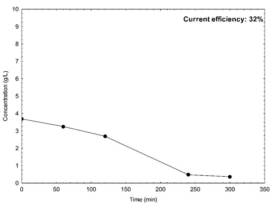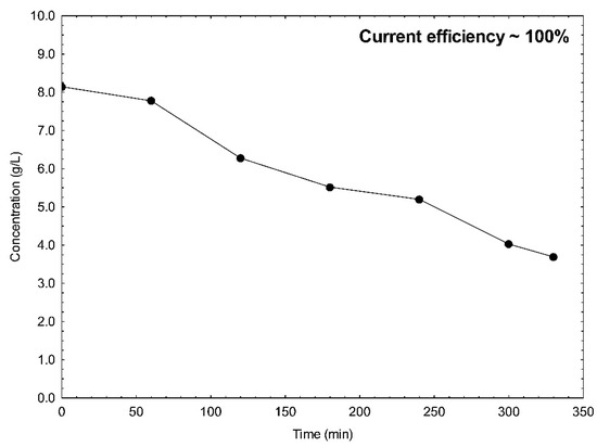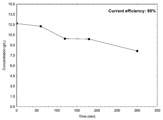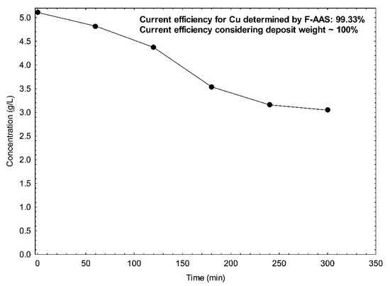 From Figure 4 and Figure 5, it can be observed that copper concentration was progressively reduced along with time, and current efficiencies were maintained approximately at 100%. Those current efficiencies were in agreement with the efficiency obtained in 120 min. In addition to the reduction in copper concentration to 3.69 g/L at 630 min, the current efficiency was maintained at 100% approximately.