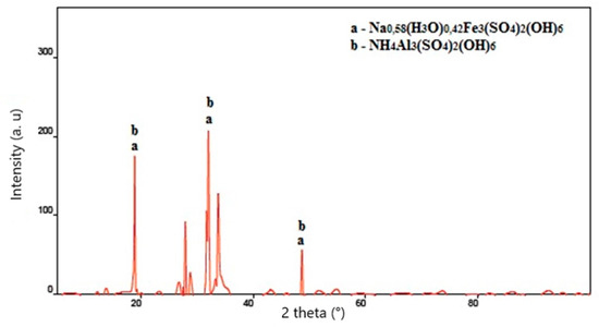 Figure 10 present the XRD diffractogram, where there was an absence of copper. However, only iron and aluminum structures were identified. Therefore, copper was not present in the precipitate, which is interesting for the conditions used in electrowinning. In addition, the precipitation of iron and aluminum up to pH 4 also contributed to purifying the leachate and consequently to the purity of the electro-obtained copper deposit.