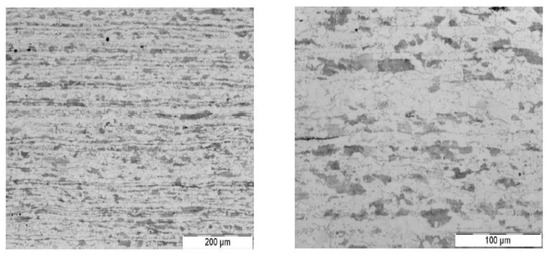 Uniaxial tensile tests were performed to obtain the main tensile properties of the different microstructures. Tensile specimens with a width of 20 mm and a parallel calibrated length of 50 mm were used. All of the specimens were machined with the parallel length oriented longitudinally to the rolling direction. The strain was measured by means of a video extensometer, using extensometer marks separated 25 mm (lo = 25 mm). The test speed was 6 MPa/s until the end of the elastic deformation, then 6.7 × 10−3 s−1 until the failure of the sample. Three specimens per condition were tested.