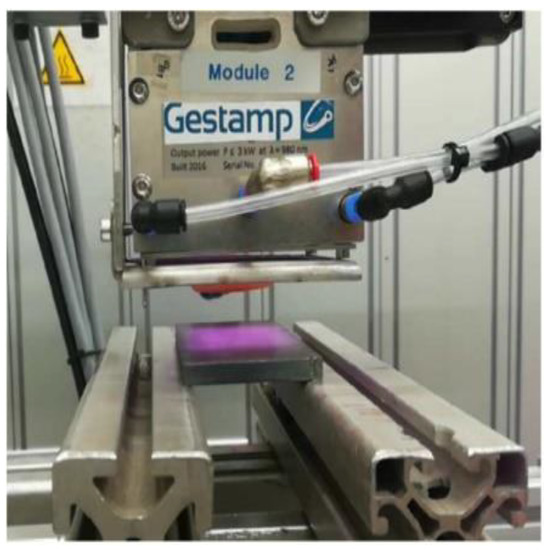 The bainitic samples were instead introduced into a tool formed by two hinged steel blocks held at a constant temperature (Figure 2). Due to limitations in the technical apparatus, no external pressure could be applied on this tool. This experiment was performed at different tool temperatures: 200, 300, 400 and 450 °C. Laser tempering was performed on the martensitic samples using a TRUMPF VCSEL Module of 2.4 kW laser equipment (Figure 3).