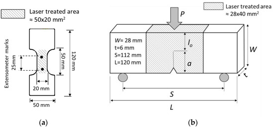 Dog-bone tensile specimens (Figure 4a) and Single Edge Notched Bending (SENB) specimens, for the EWF tests (Figure 4b), were wire-cut from the heat-treated blanks, produced as described above. In the case of the laser-tempered material, samples were cut from the fully martensitic blanks and laser tempering was applied on the area of interest (Figure 4a,b).