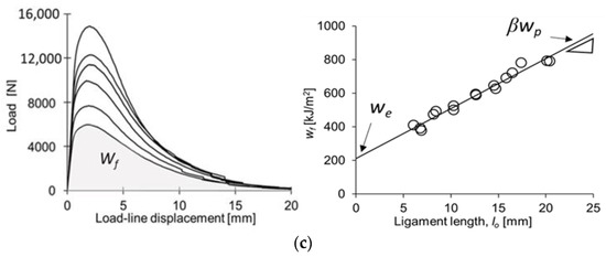 For each specimen, the total work of fracture (Wf, area under the load-displacement curve, Figure 4c left) was calculated and normalized by the cross-section area, obtaining the specific total work of fracture (wf). we was obtained through the linear extrapolation of the wf vs. lo data to zero ligament length. The slope in the linear data regression represents the non-essential plastic work, wp, multiplied by a shape geometry factor, β (Figure 4c right). Ligament lengths ranging between 6 and 20 mm (a/W = 0.29–0.79) were used. Two specimens per ligament length were tested. The tests were conducted at a constant cross-head displacement of 1 mm/min. The distance between supports, S, was 112 mm. To avoid the effect of the notch radius on the fracture toughness values, a fatigue pre-crack was nucleated on the notch root, following the recommendations of the fracture mechanics standard procedures.